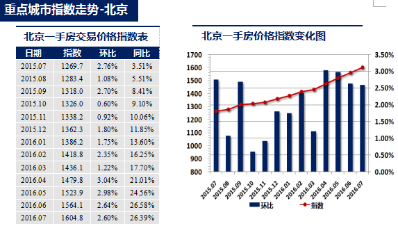 ??2016年7月,北京一手房交易价格指数为1604.8点,较上月上升40.7点,环比上涨2.60%,同比涨幅为26.39%。