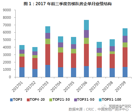 ??虽然9月各梯队房企的销售业绩均有回升,但从2017年至今三个季度单季度的业绩来看,TOP100房企第三季度的销售规模低于二季度,环比显著减少11.8%,仅略高于一季度水平。分梯队来看,TOP21-30梯队的房企业绩较二季度环比降幅最大达29.3%,TOP3的三家龙头房企三季度的业绩也有所回落。
