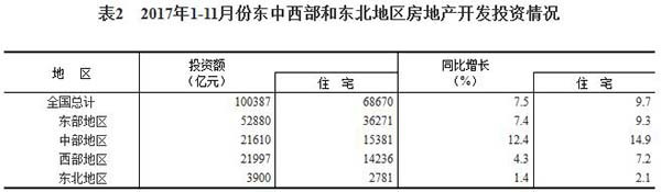 ??1-11月份,东部地区房地产开发投资52880亿元,同比增长7.4%,增速比1-10月份回落0.6个百分点;中部地区投资21610亿元,增长12.4%,增速回落0.7个百分点;西部地区投资21997亿元,增长4.3%,增速提高0.2个百分点;东北地区投资3900亿元,增长1.4%,1-10月份为下降0.4%。