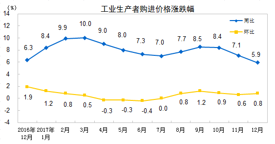 ??2017年12月份,全国工业生产者出厂价格同比上涨4.9%,环比上涨0.8%。工业生产者购进价格同比上涨5.9%,环比上涨0.8%。2017年全年,工业生产者出厂价格同比上涨6.3%,工业生产者购进价格同比上涨8.1%。