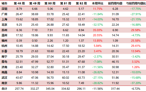本周典型城市商品住宅总成交面积为296.11万平方米,环比下降11.56%,成交量有所下滑。一线城市中深圳止跌上涨;上海、广州连续三周下滑,成交量处于低谷,北京明显下滑,跌幅超过三成。5个二线城市环比上涨,苏州涨幅最大为35.03%,但成交量不到9万平方米,温州涨幅超过20%;杭州、长春连续两周上涨,成交量保持小幅回升。6个下滑的城市中南宁、青岛虽连续两周下滑,但跌幅较小;济南本周跌幅超过一成,但成交量始终保持在30万平方米以上;南昌、武汉、南京跌幅在26%-29%之间,其中南京连续两周下滑,创今年来除春节外的周度成交量新低。中央经济工作会议后,北京、郑州等热点城市继续深化和加强楼市政策,政策调控仍将持续一段时间。